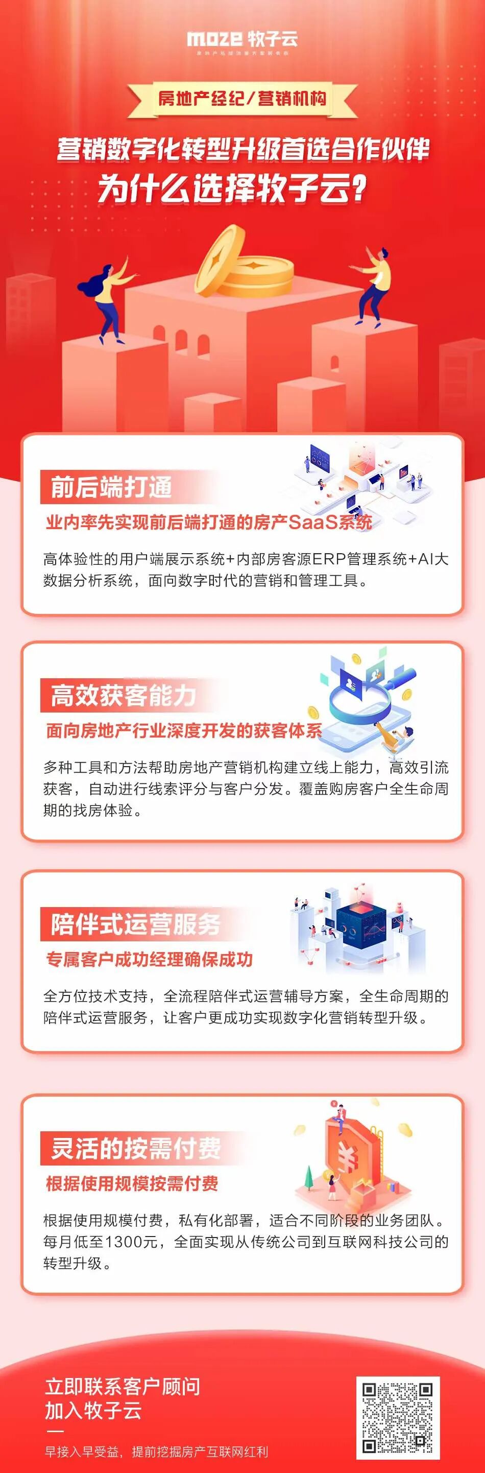房地产经纪/营销机构,数字化营销转型升级,离不开工具支撑。一个好的数字化营销工具,不但要解决前端营销获客的问题,更要解决后端客源房源的管理的问题。链家在行业内率先实现了前端+后端系统的打通,以“真房源”为卖点,成为业内数字化转型的标杆。贝壳也在其基础上升级迭代,取得了巨大成功。具体来看,经纪行业的营销数字化,不仅仅是一个获客官网或用户端小程序,而是要实现人、房、客三个维度的全面数字化。对人(经纪人)的数字化。经纪人从线上拓客到线下带看成交,每一个动作都可以通过数字手段记录、量化、考核,并通过大数据分析,发现最高效的作业路径,进而优化复制、提高所有人的运营效率。在这个过程中,对经纪人参与数字化建设的激励和考核非常重要。将经纪人的日常工作细化,形成可数字化的评价指标,通过积分、信用分、资源优先分配等方式,激励经纪人持续参与。对房(房源)的数字化。房的数字化包含2个方面:首先对房源和小区进行多维度的信息采集,建立楼盘字典,通过视频、VR、图文攻略等形式,提高用户看房体验和效率。其次,通过对小区价格的跟踪、对房源的综合评分,自动发现当下的热点商圈或优质房源,进而根据客户画像自动匹配目标客户。对客(购房客户)的数字化。一方面,客户的成交周期变长,经纪人与客户的连接要适应新的社交媒体形式,通过有价值的内容去触达客户。另一方面,用数字手段分析客户访问轨迹,通过客户对内容的感兴趣程度、阅读时长、类别喜好等行为分析,挖掘客户需求,进行客户画像,并通过客户打分自动发现高意向客户,推送经纪人进行针对性跟进。当然,除了对人房客的数字化升级,我们更需要思考的是,如何通过数字化手段提高线上获客、线上拓客能力。这是房地产进入买方市场后,每个公司都要修炼的基本功。在线上流量分散且昂贵的环境下,经纪公司提高获客和拓客能力,最核心的就是要做好私域流量,具体思路请阅读《经纪公司如何做好私域流量》。实现数字化营销转型升级,属于战略层面的任务。需要决策层有新的认知、新的工具、新的团队。与此同时,数字化营销转型升级,也是一项跨专业的工作,大多数公司需要借助外部力量支撑。一套适应未来的数字化营销工具、一套有效的运营思路和方法和一个有实战经验的服务团队,是成功实现数字化转型升级必不可少的要素。房地产经纪营销机构数字化转型为什么首选牧子云?牧子数智开发的牧子云房产SaaS系统,针对房地产行业深度开发和定制,面向房地产经纪、代理、媒体等营销机构,提供全程技术服务和运营解决方案。相对行业内同类产品,牧子云有以下几个亮点:1、前后端打通:业内率先实现前后端打通的房产SaaS系统高体验性的用户端展示系统+内部房客源ERP管理系统+AI大数据分析系统,面向数字时代的营销和管理工具,全面实现人房客的数字化升级管理。2、高效获客能力:面向房地产行业深度开发的获客体系多种工具和方法帮助房地产营销机构建立线上能力,高效引流获客,自动进行线索评分与客户分发。覆盖购房客户全生命周期的找房体验。3、陪伴式运营服务:专属客户成功经理确保成功全方位技术支持,全流程陪伴式运营辅导方案,全生命周期的陪伴式运营服务,让客户更成功实现数字化营销转型升级。4、灵活的按需付费:根据使用规模按需付费根据使用规模付费,私有化部署,适合不同阶段的业务团队。每月低至1300元,全面实现从传统公司到互联网科技公司的转型升级。— END —牧子数智,专注于房地产经纪/营销领域营销数字化平台建设、私域流量技术服务。帮助经纪机构搭建属于自己的官方线上平台。 — 参考资料 — 来源:牧子数智-牧子云