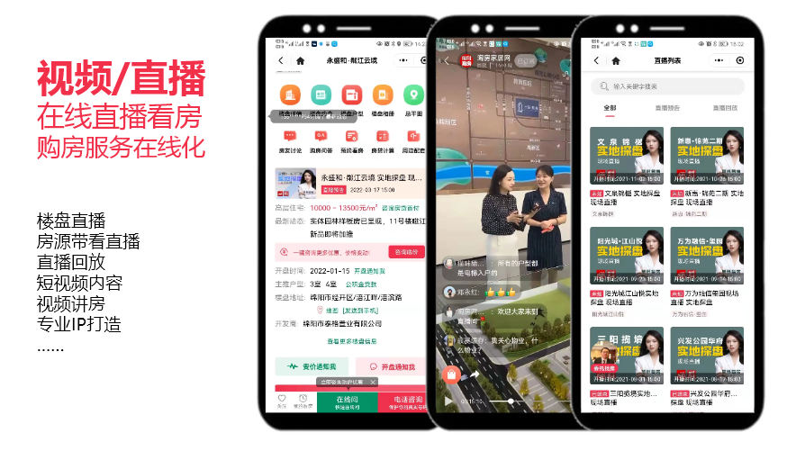直播看房、视频讲房是作为一个平台的内容功能去呈现,购房者可以在线看相关视频或者直播回放去沉浸式了解相关信息,比如探盘视频、探盘直播,购房者可以跟着主播从进售房部到出售房部,全流程看房;并且因为疫情或者天气原因,购房者更愿意通过在线观看。