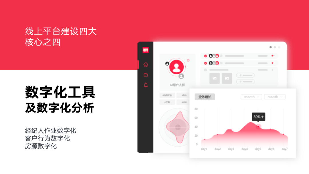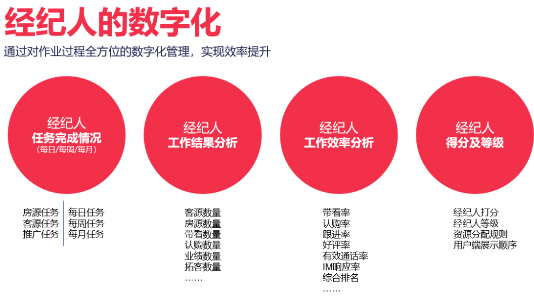 首先,我们要实现人的数字化。对经纪人做全方位的数字化分析和行为记录,筛选出优秀的经纪人,总结出一些成功的工作方法,推广到全公司,提升整体的效率。