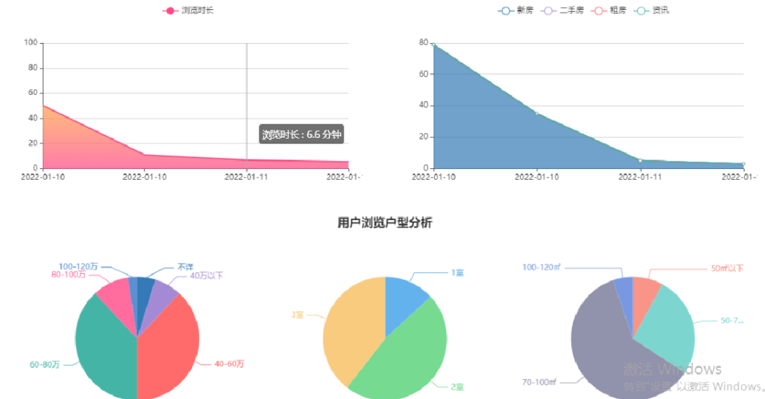 我们还可以对内容(比如资讯、楼盘详情、房源详情 )进行详细的解读,一个内容的访问趋势是怎么样,访问热点是什么时候,平均访问时长等等。