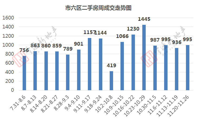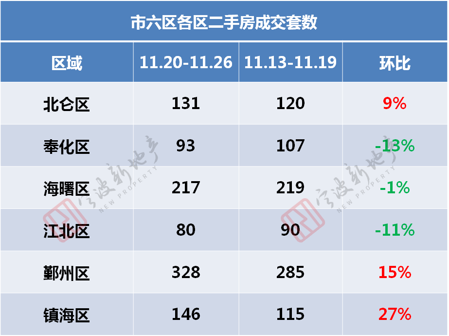 二手房方面,根据宁波市房产交易信息服务网显示,上周市六区二手房(含住宅、商业、车位等)成交995套,环比(936套)上升6%。