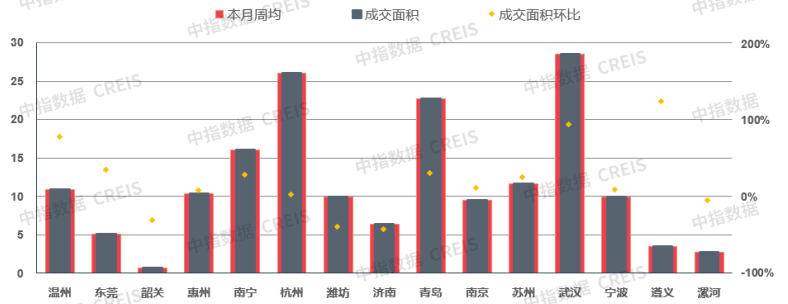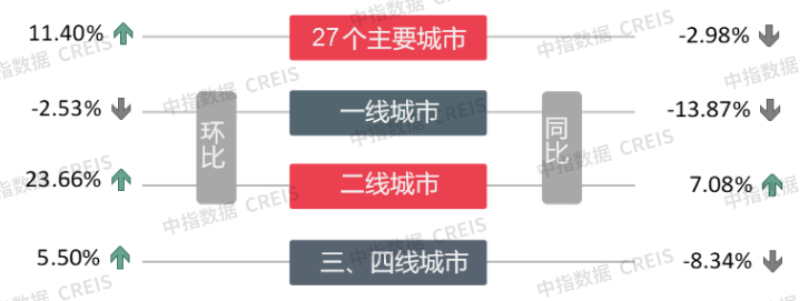 二线代表城市整体成交面积环比上涨23.66%。分城市来看,武汉涨幅最大(94.06%),温州次之(78.62%);济南则环比下降,降幅为43.45%。同比来看,二线代表城市整体同比上涨7.08%。三四线代表城市整体环比上涨5.50%,同比下降8.34%。