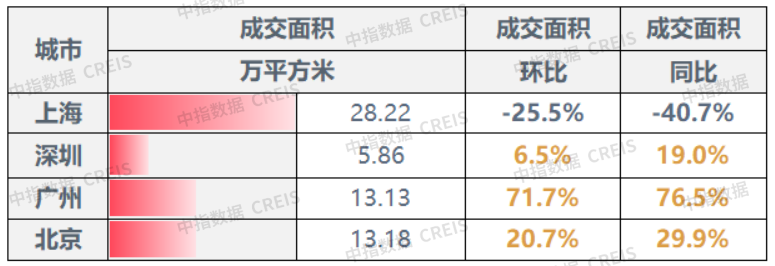 上周,一线城市成交面积整体环比略降2.53%,同比下降13.87%。分城市来看,广州、北京、深圳成交面积环比均上涨,其中,广州因上期成交量较小,环比涨幅最大,为71.7%;北京、深圳次之;上海则成交面积环比下降,降幅为25.5%。同比来看,4城市涨跌秩序一致,广州、北京和深圳上涨,上海则同比下降。