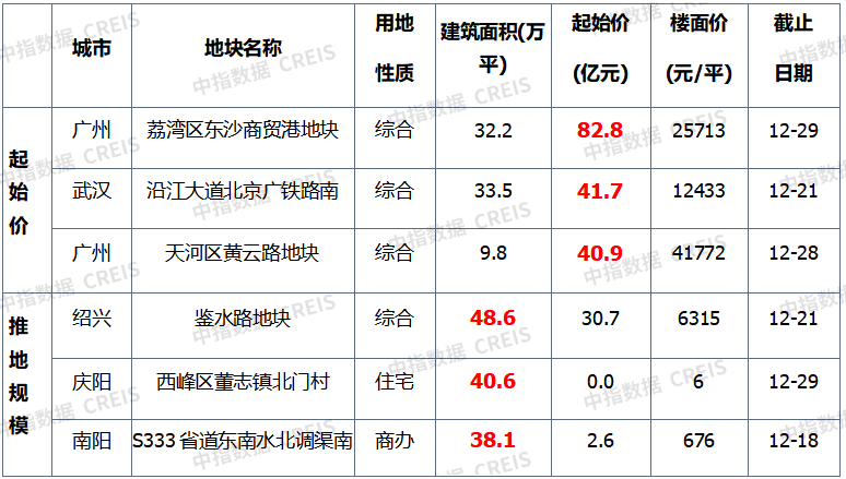 上周,房企拿地城市主要集中北京、重庆、苏州、无锡、厦门、武汉等地,其中,11月30日,据北京规自委消息,北京建工以底价35.4亿元摘得北京市昌平区沙河镇西沙屯村、满井西队村棚户区地块。出让文件显示,该地块为改造土地开发B地块项目CP01-0201-0001、0002、0009地块,楼面价为2.4万元/平方米,总土地面积6.6万平方米,建筑面积15.44万平方米,为居住、基础教育用地,容积率2.55/2.66,控制高度60米,绿地率30%,销售指导价为期房5万元/平方米,现房5.2万元/平方米,浮动8%,控高60米,配建一所15班幼儿园;11月29日,苏州进行八批次土地出让。本次共出让6宗涉宅地,总起始价68.24亿元,总出让面积约达28.62万平方米,包括吴中区3宗、相城区1宗、工业园区2宗。值得注意的是,6宗地块全部未设置土地上限价格。经过120轮竞价,金隅以总价28.97亿元摘得工业园区锦溪街东、西洛巷南地块,楼面价39027元/平方米,溢价率30.09%。该地块为城镇住宅用地,总起价为22.27亿元,出让面积49479.43平方米,容积率大于等1.2-1.5。地块于今年年中的《苏州工业园区2023年第五批次局部地块控规调整公示文件》进行了控规调整,本次调整是将原来的白地改为了二类居住用地,未来或将打造低密洋房产品。