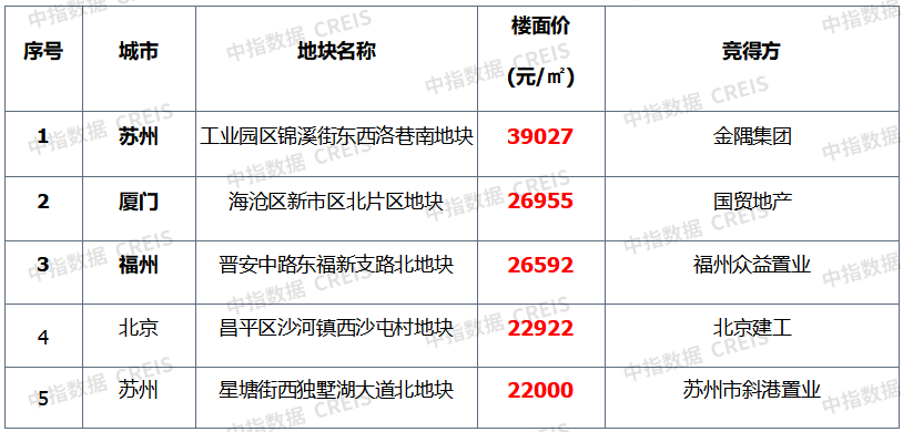 表:全国住宅用地楼面单价TOP5