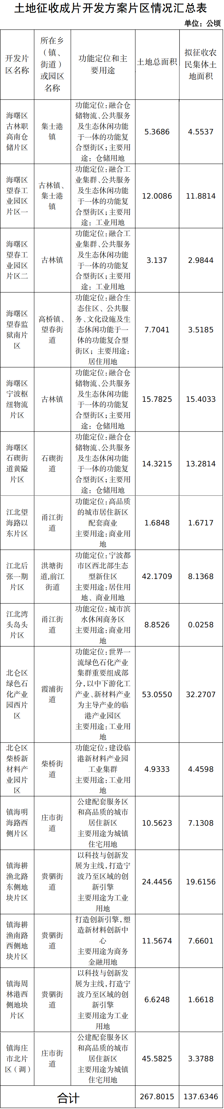 进粉丝群请扫上方二维码宁波市资规局日前就《宁波市2024年土地征收成片开发方案(征求意见稿)》公开征求意见。按征求意见稿,2024、2025、2026三年,海曙、江北、镇海、北仑四区共16个开发片区,计划征收农民集体土地逾137公顷(约2064.5亩)。海曙:6个,涉及望春街道、高桥镇、集士港镇、古林镇、石碶街道。各片区名称及其功能定位、土地主要用途、拟征收农民集体土地面积,见下表: